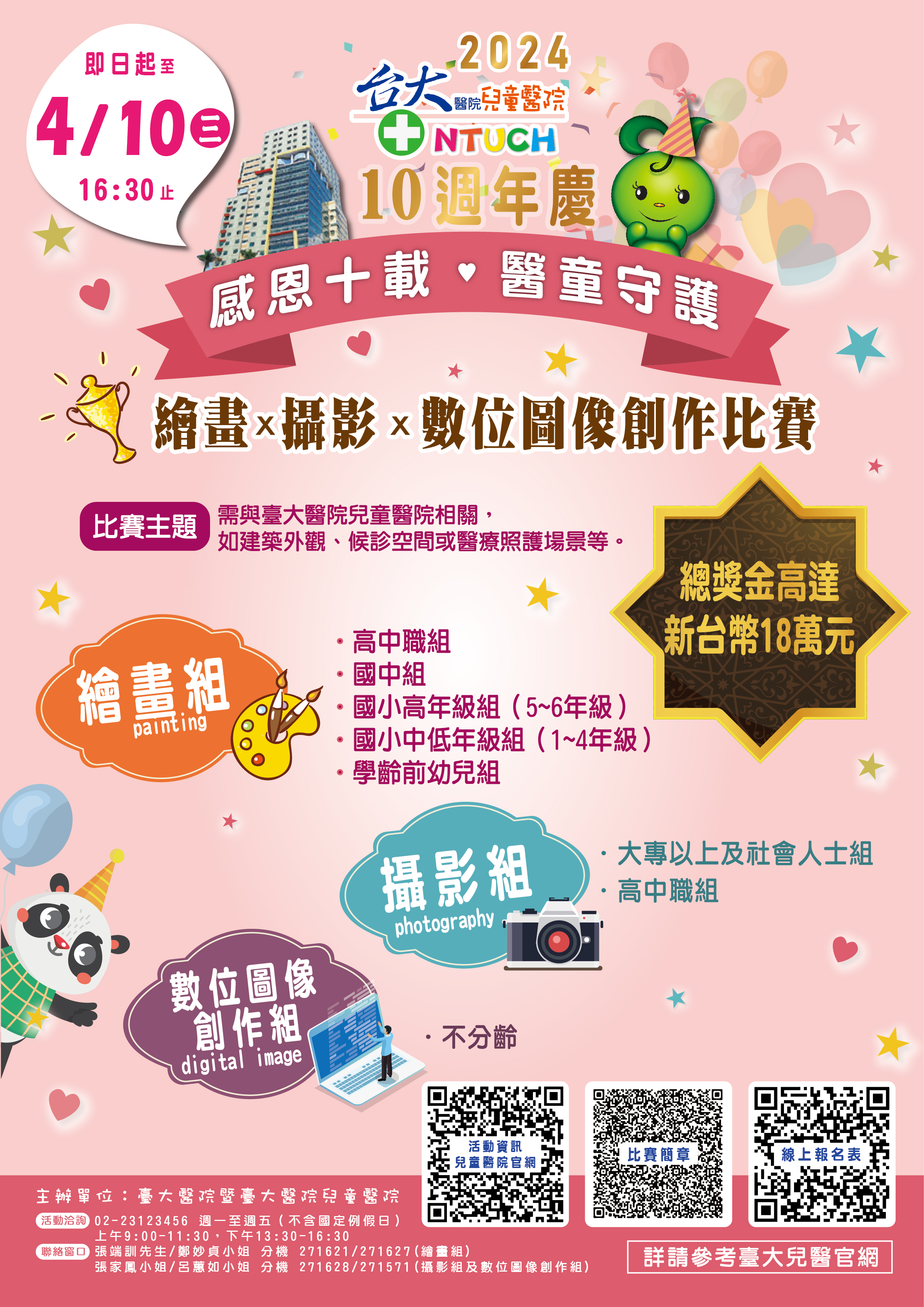 有關國立臺灣大學醫學院附設醫院暨兒童醫院辦理「2024臺大醫院兒童醫院10週年慶-感恩十載.醫童守護-繪畫、攝影與數位創作比賽」