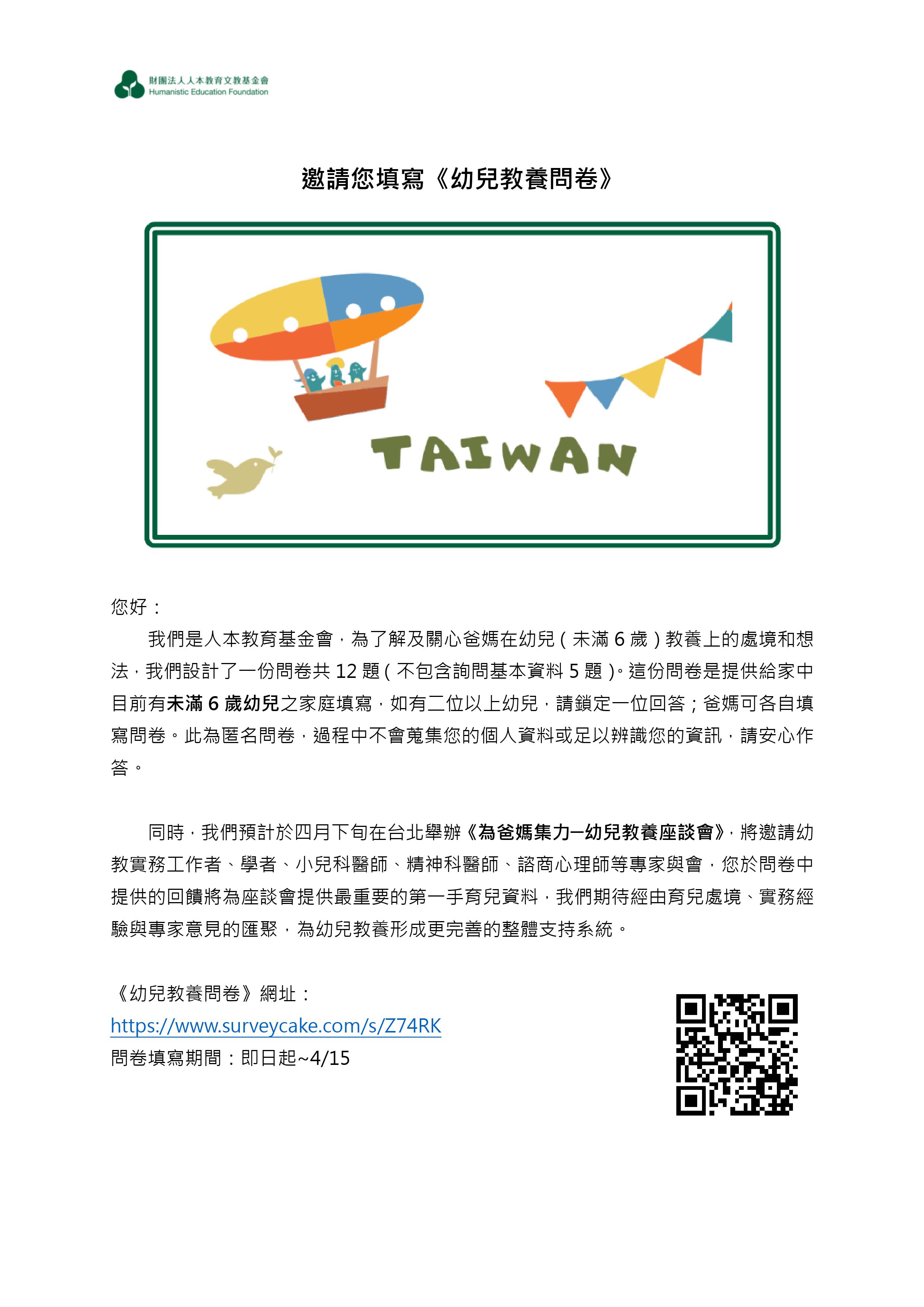 財團法人人本教育文教基金會敬邀貴園所響應430國際不打小孩日活動:以團體名義加入「與孩子立約」行列,並協助邀請家長填寫《幼兒教養問卷》。