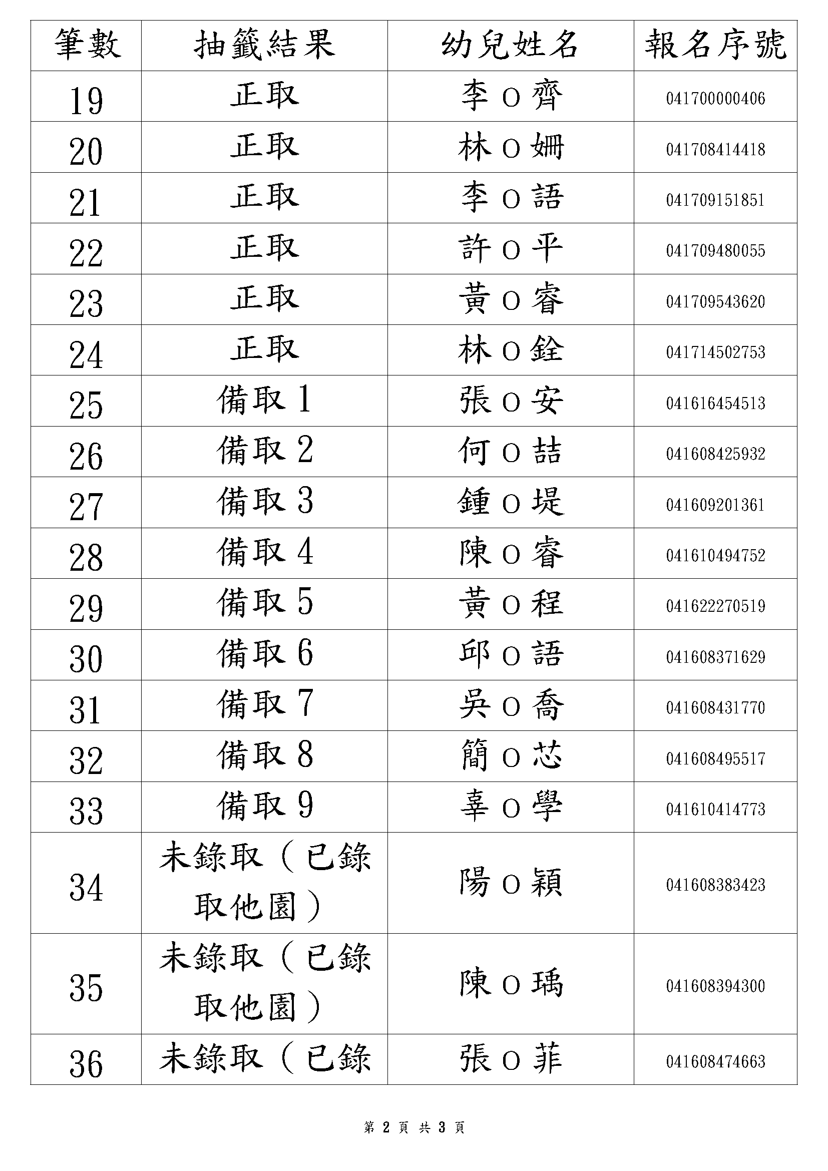 平鎮幼兒園南勢分班(3-5歲)錄取名單