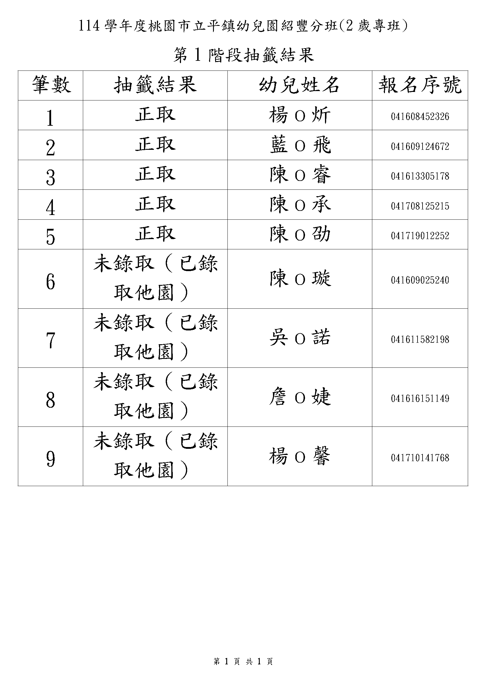 平鎮幼兒園紹豐分班(2 歲專班)錄取名單