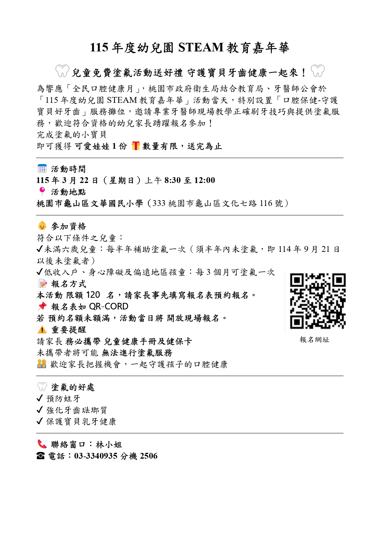 為了推動兒童口腔保健,桃園市政府衛生局特別於「115年度幼兒園 STEAM 教育嘉年華」活動中,設置了「口腔保健-守護寶貝好牙齒」服務攤位。