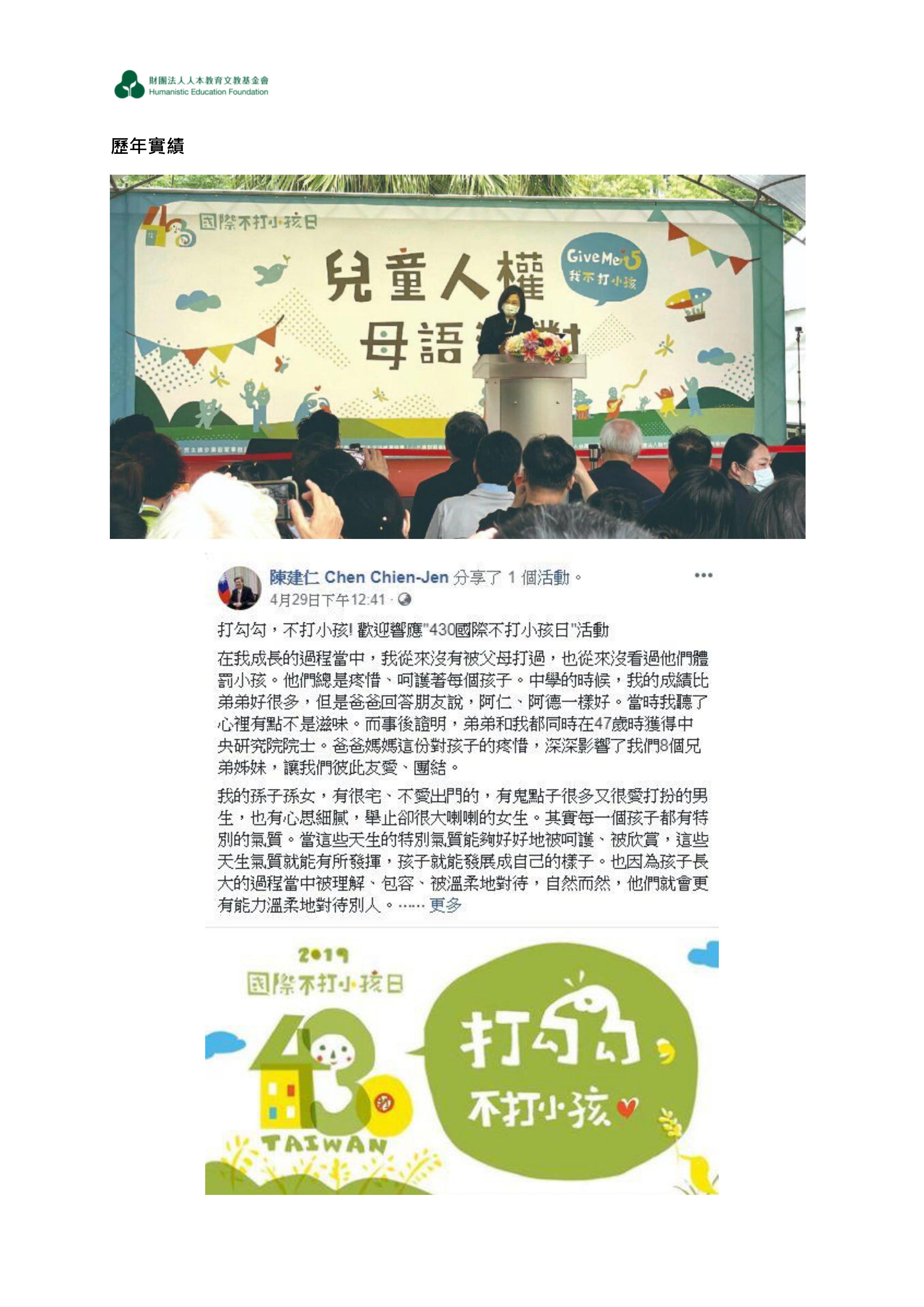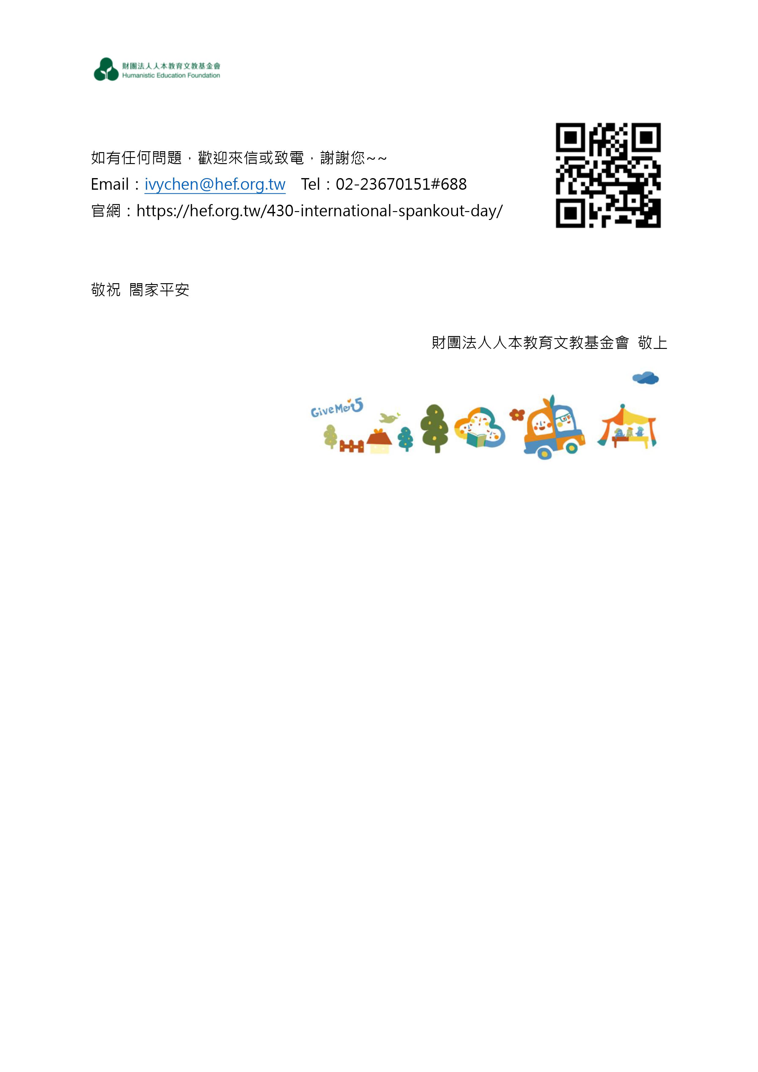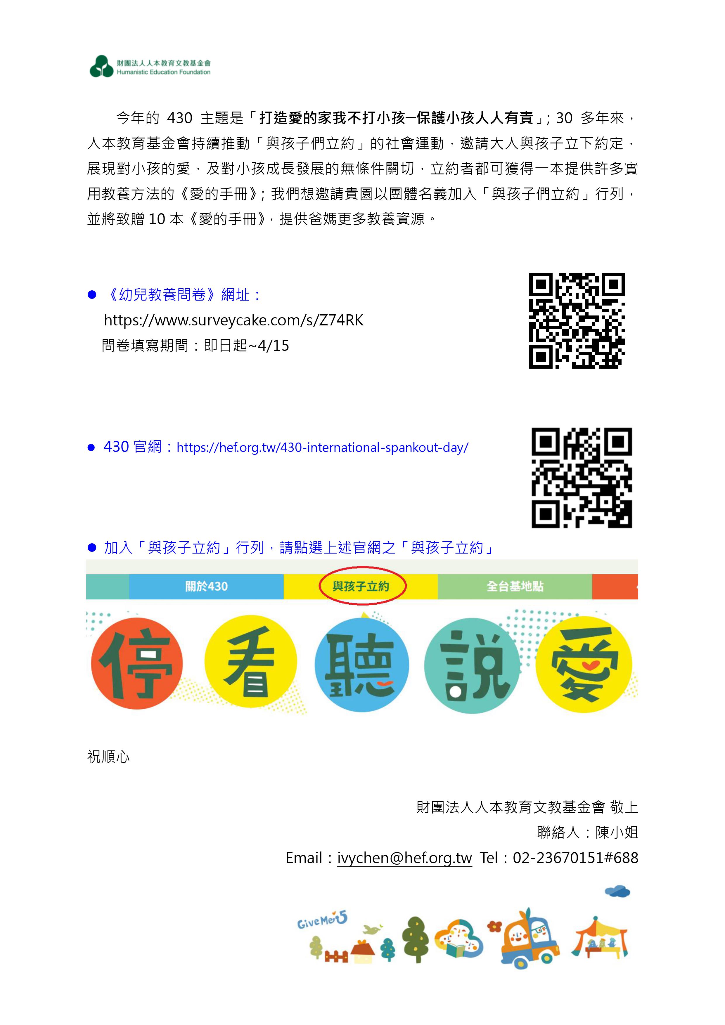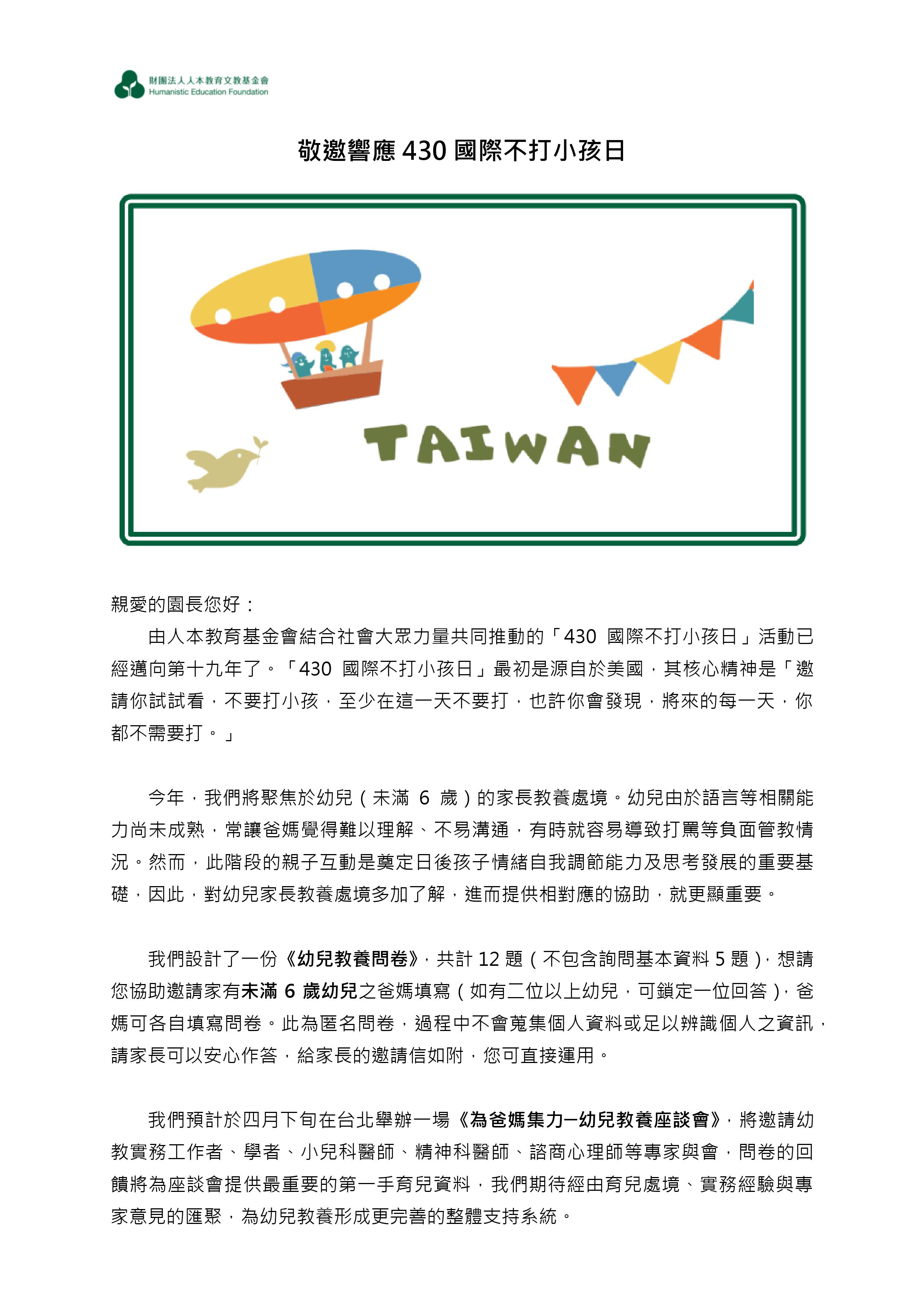 財團法人人本教育文教基金會敬邀貴園所響應430國際不打小孩日活動:以團體名義加入「與孩子立約」行列,並協助邀請家長填寫《幼兒教養問卷》。