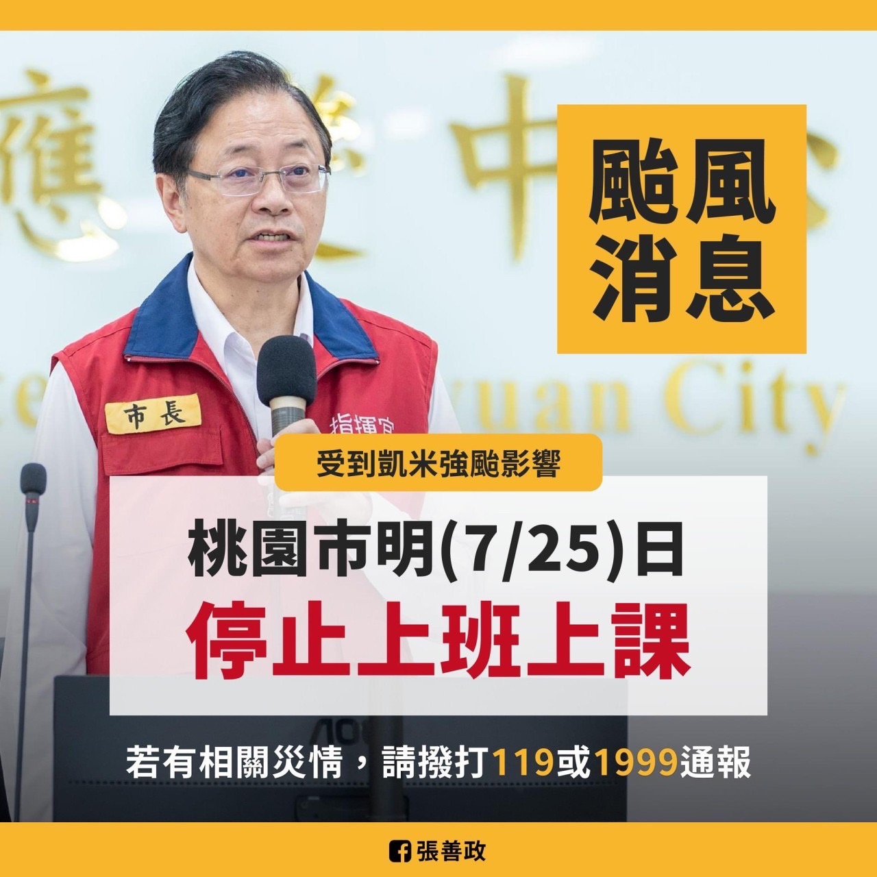 【7月25日停課通知】受「凱米」颱風影響,7/25停止上班、停止上課。