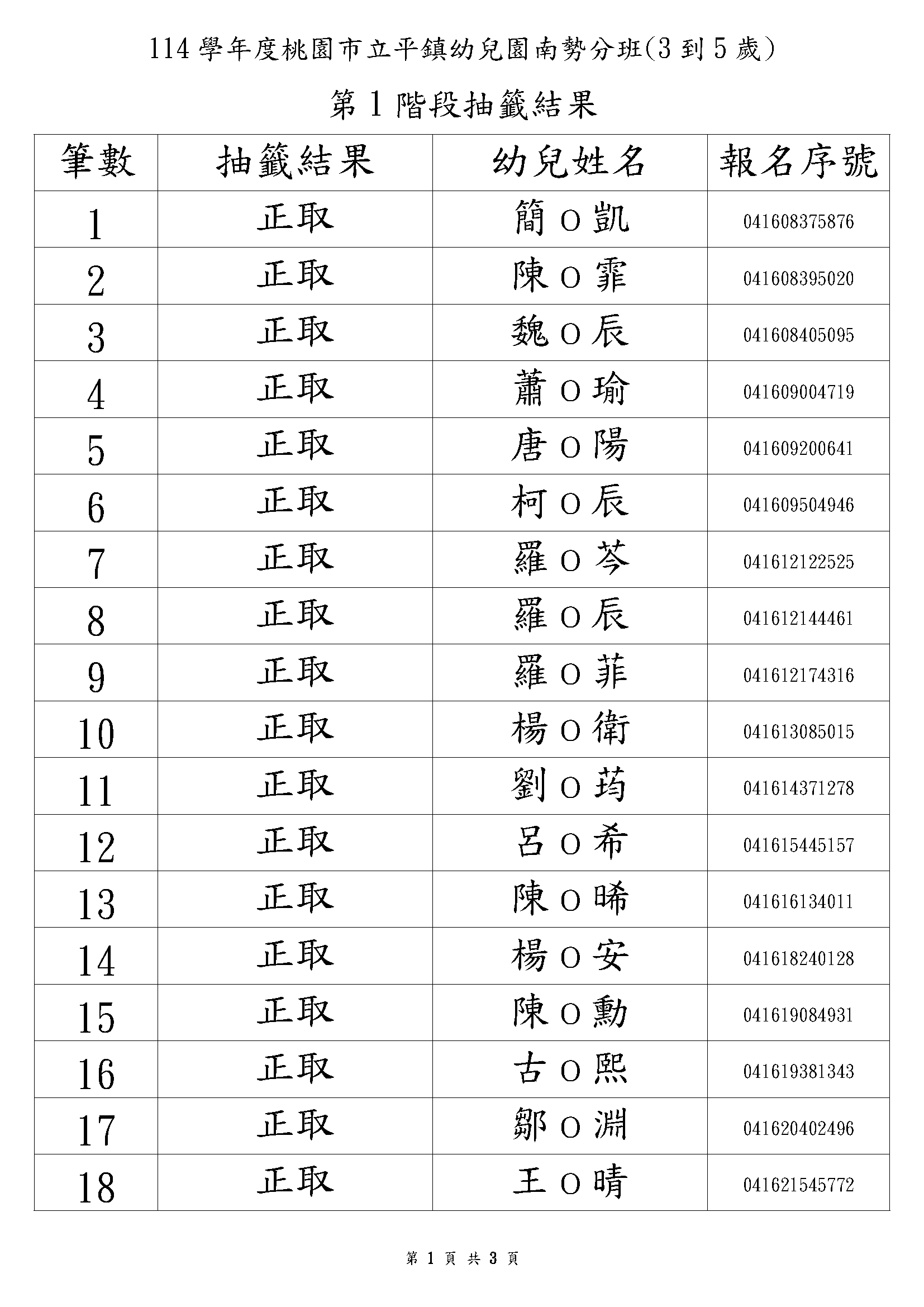 平鎮幼兒園南勢分班(3-5歲)錄取名單