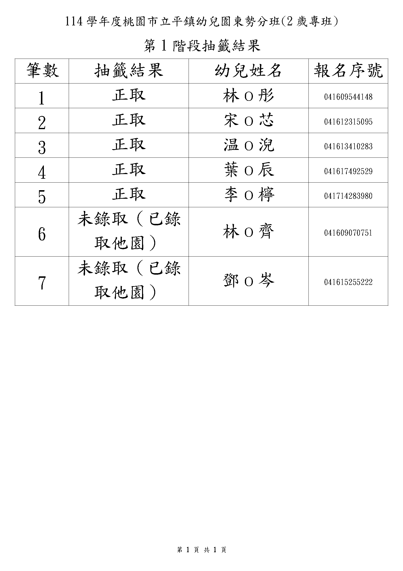 平鎮幼兒園東勢分班(2 歲專班)錄取名單