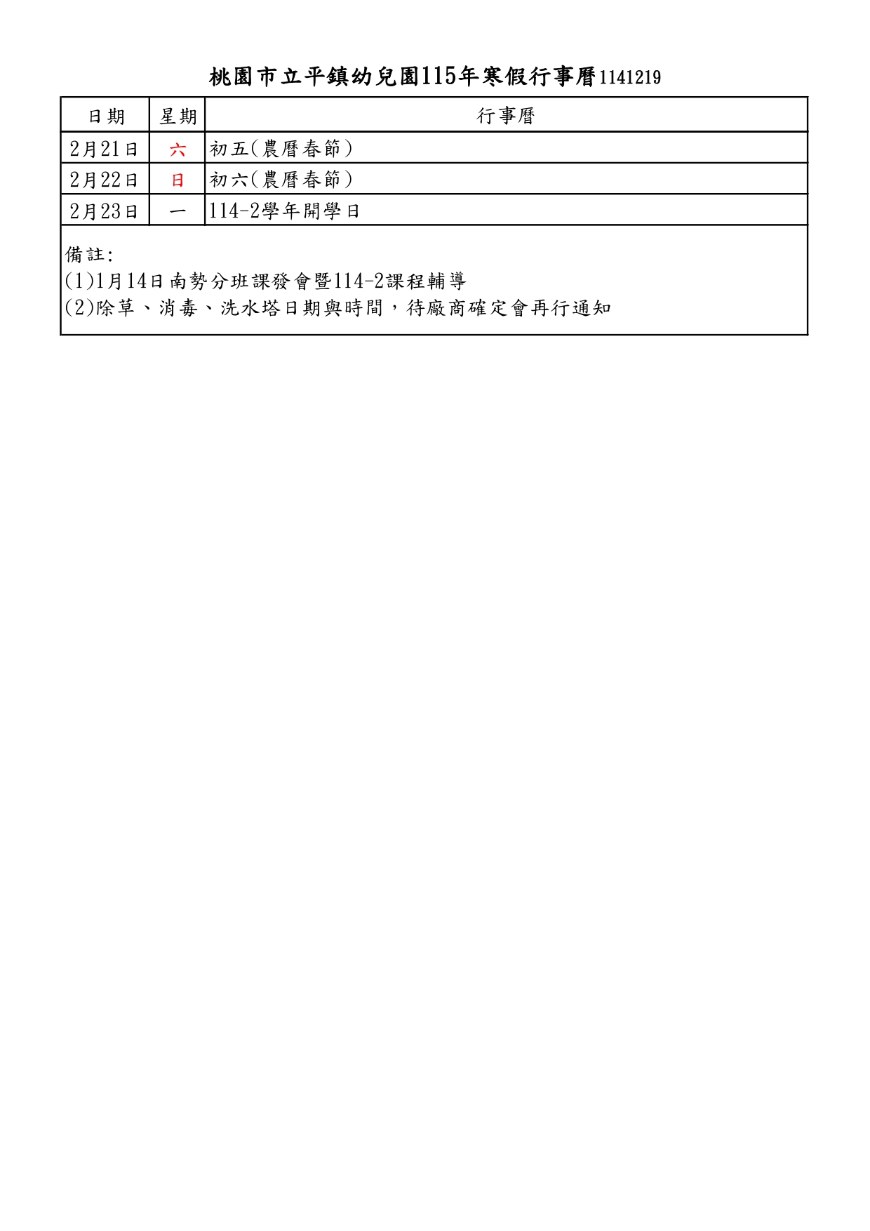 桃園市立平鎮幼兒園 115年寒假行事曆