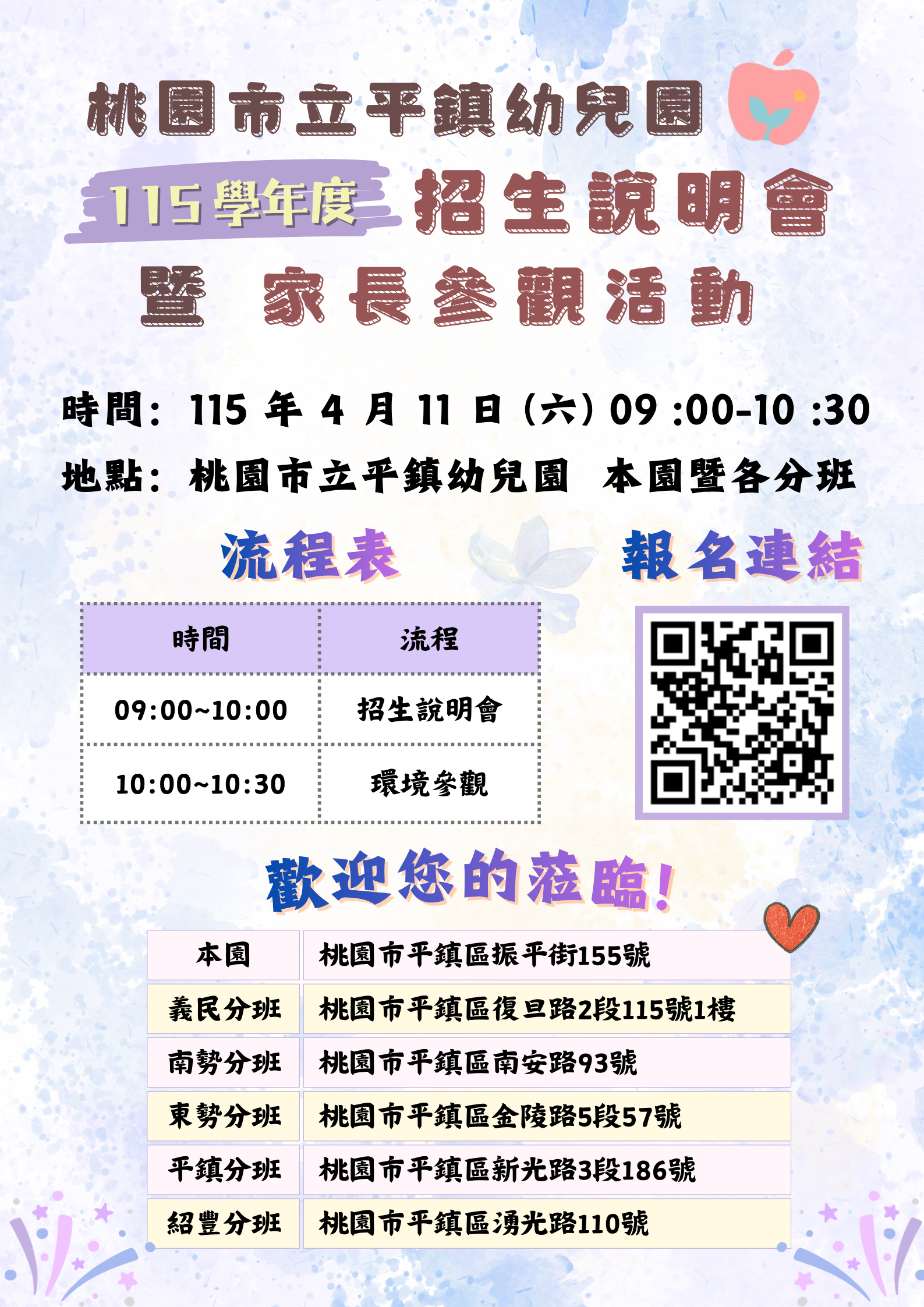 感謝您對平鎮幼兒園 115 學年度招生活動的關注!